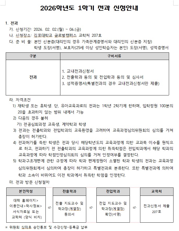 2026학년도 1학기 전과 신청 안내 작성자 교학처 작성일 2026-01-19 11:27 조회 366 좋아요 0 싫어요 0 인쇄 5.-전과신청서2025.07.hwp « 2026학년도 1학기 휴학, 복학 신청기간 안내 2026학년도 1학기 재입학 신청 안내 » 목록보기 콘텐츠담당자 담당 부서 : 교학처 TEL : 031-999-4039 FAX : 031-999-4038 E-MAIL : gyohak@kimpo.ac. kr 수정일자 : 2019.10.06