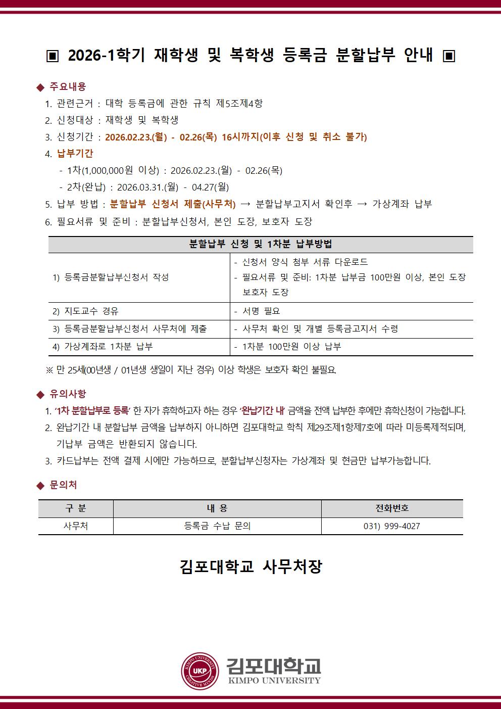 2026-1학기 재학생 및 복학생 등록금 분할납부 안내 작성자 사무처 작성일 2026-01-28 14:20 조회 448 좋아요 0 싫어요 0 인쇄 2026-1학기-등록금-분할납부_신청서.pdf « 2026-1학기 재학생 및 복학생 등록 안내 목록보기 콘텐츠담당자 담당 부서 : 교학처 TEL : 031-999-4039 FAX : 031-999-4038 E-MAIL : gyohak@kimpo.ac. kr 수정일자 : 2019.10.06