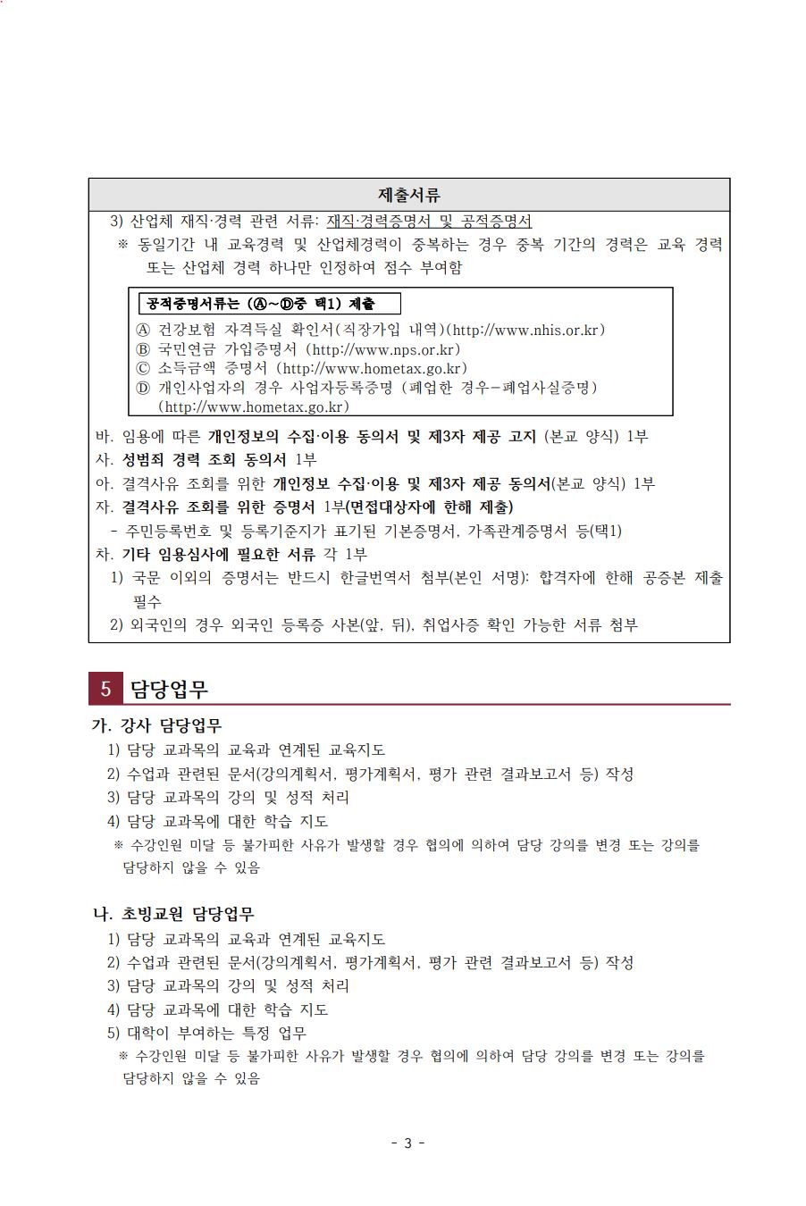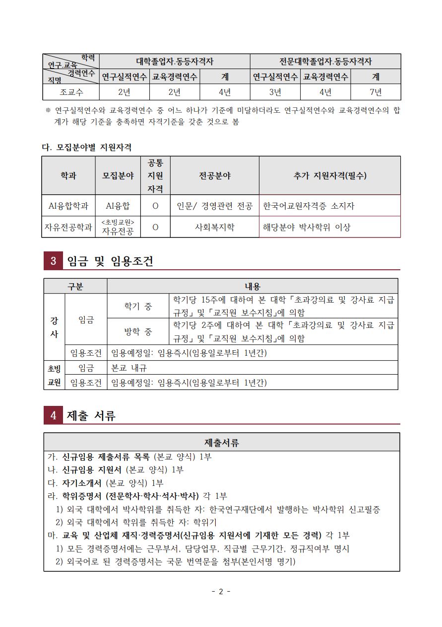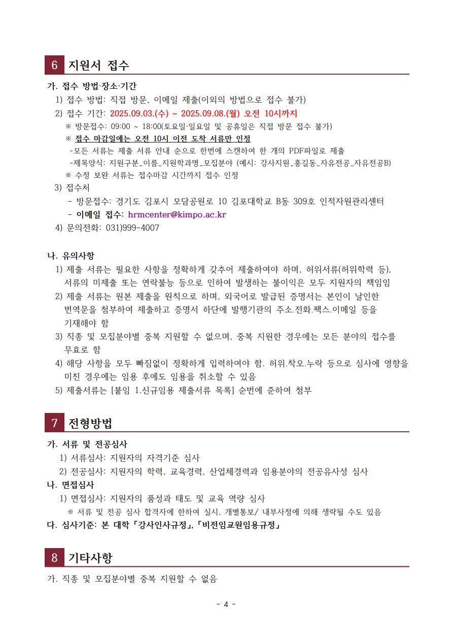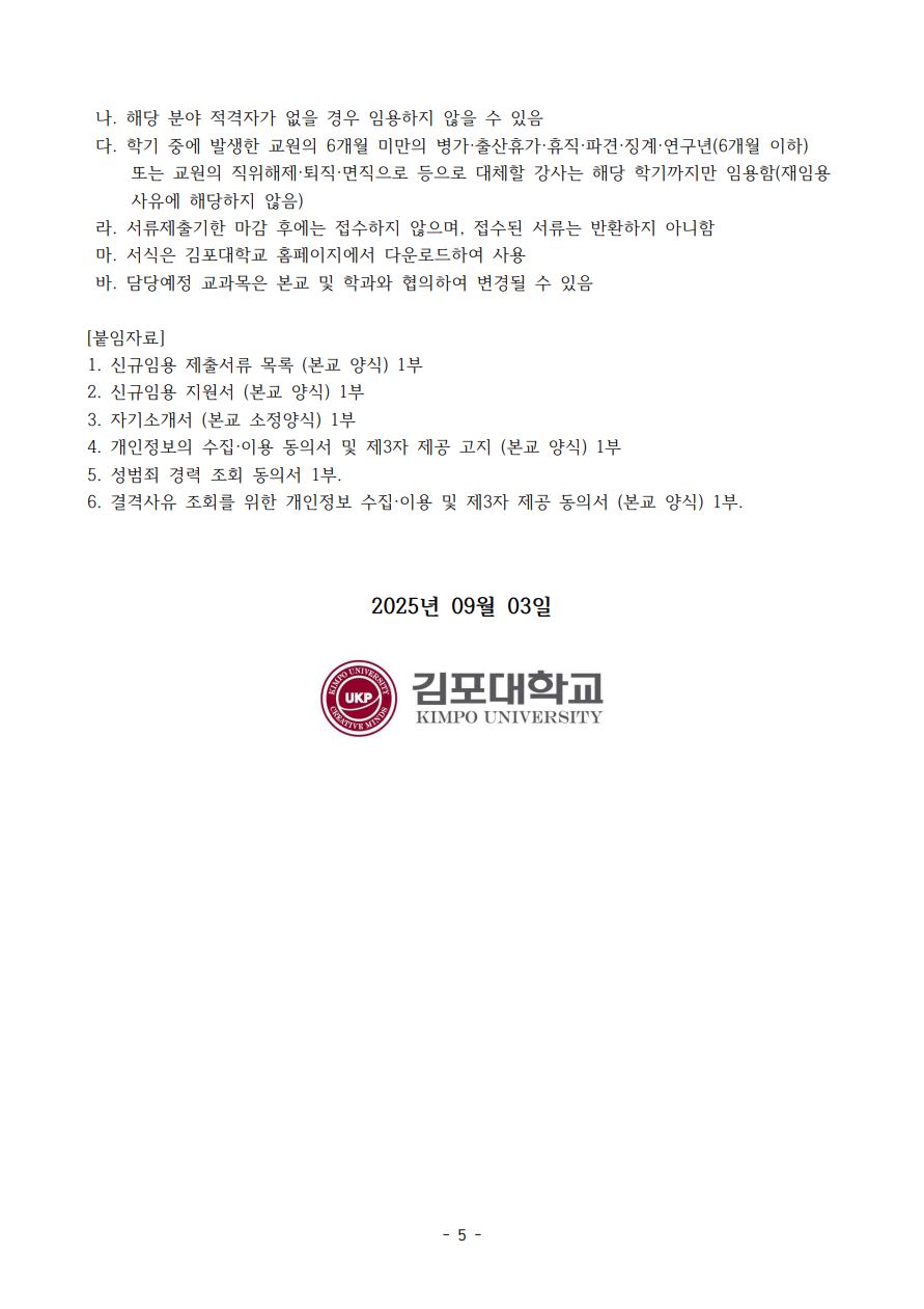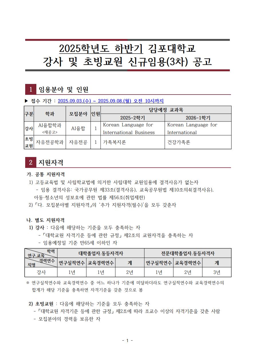 2025학년도 하반기 김포대학교 강사 및 초빙교원 신규임용(3차) 공고 작성자 인적자원관리센터 작성일 2025-09-03 11:07 조회 10548 좋아요 0 싫어요 0 인쇄 3_공개채용-공고문-및-제출서류안.hwp « 김포대학교 RISE사업단 직원(계약직) 채용 공고 김포대학교 직원 채용 공고 » 목록보기 콘텐츠담당자 담당부서 : 개별부서 수정일자 : 2024.02