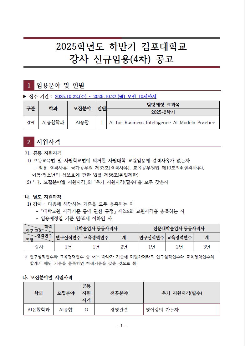 2025학년도 하반기 김포대학교 강사 신규임용(4차) 공고 작성자 인적자원관리센터 작성일 2025-10-22 10:49 조회 1285 좋아요 0 싫어요 0 인쇄 3_공개채용-공고문-및-제출서류안.hwp « 김포대학교 직원 채용 공고 2025학년도 제2차 학칙 및 학칙시행세칙 입안 내용 공고 » 목록보기 콘텐츠담당자 담당부서 : 개별부서 수정일자 : 2024.02