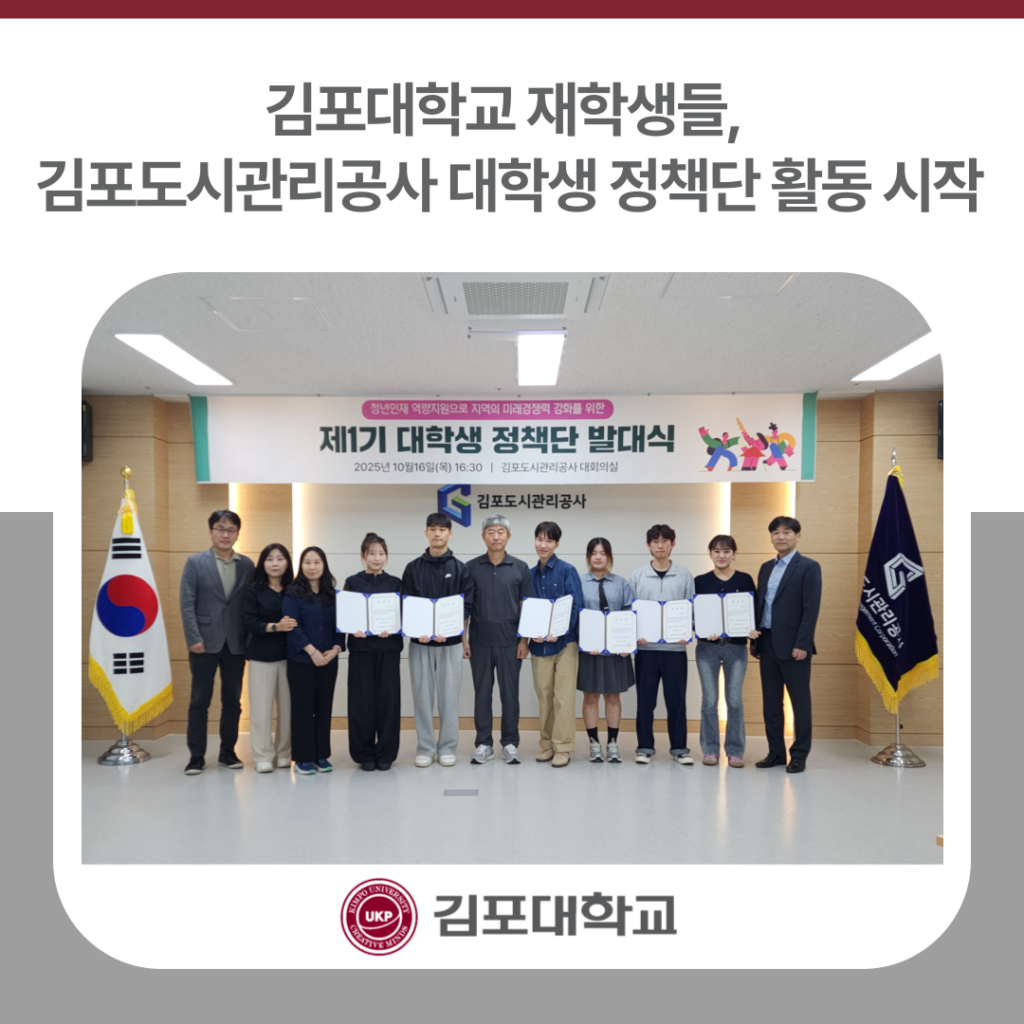 김포대학교(총장 박진영) 재학생들이 김포도시관리공사와 함께 지역 도시 발전에 참여하는 ‘대학생 정책단’으로 활동을 시작했다. 지난 10월 16일 열린 발대식에는 김포도시관리공사 이형록 사장과 김포대학교 조휘형 미래인재센터장, 그리고 정책단에 선발된 대학생들이 참석해 본격적인 활동의 시작을 알렸다. 이번 정책단은 청년의 시각에서 도시 관리 정책과 현장을 이해하고, 참신한 아이디어를 제안해 김포시의 지속 가능한 발전에 기여하기 위해 구성된 프로그램이다. 특히 […]