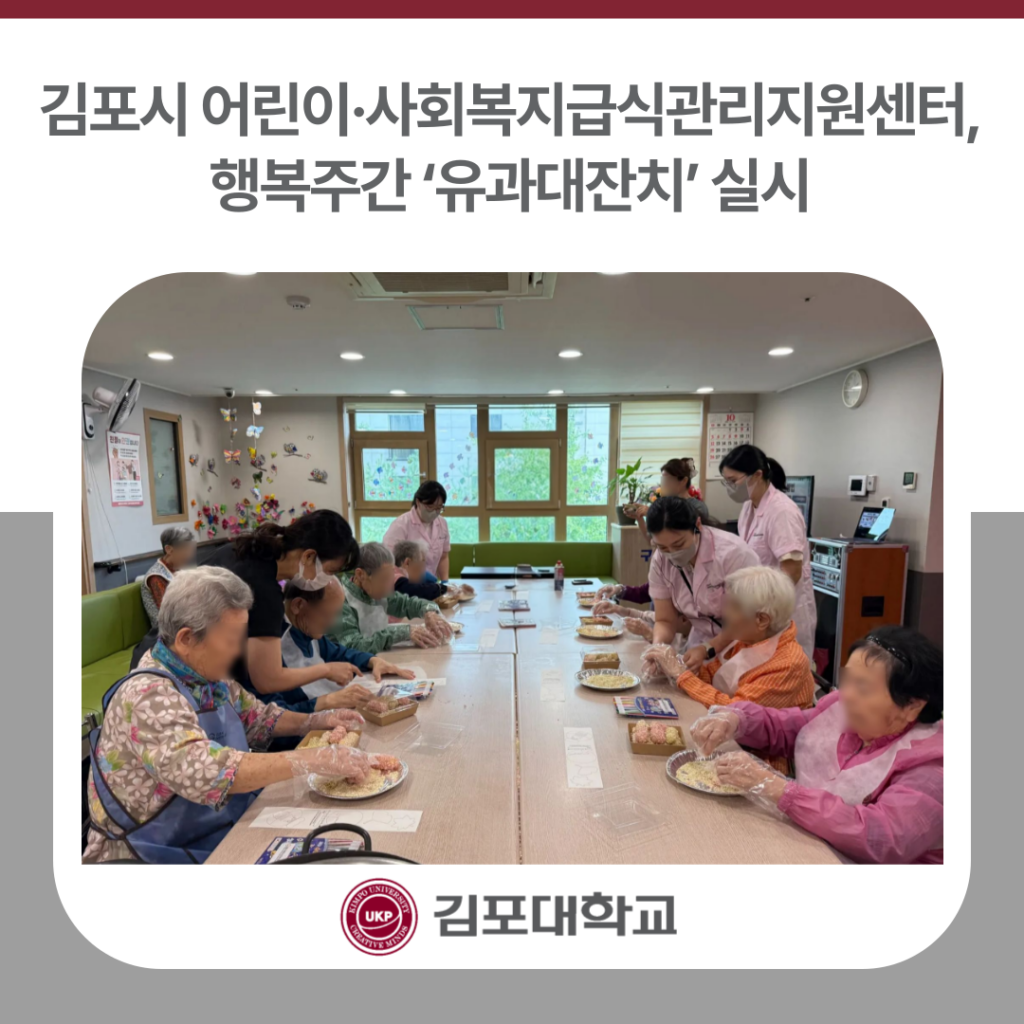 김포대학교(총장 박진영)가 위탁 운영하는 김포시 어린이사〮회복지급식관리지원센터(센터장 송승헌, 이하 ‘센터’)는 10월 2일 노인의 날과 추석의 의미를 되새기고 어르신과 센터 간의 친밀감 형성을 돕고자 2025 행복주간 ‘유과대잔치’ 행사를 실시했다. 이번 행사는 유과와 포장 띠지 만들기를 통한 소근육 자극과 함께 전통 한국 과자를 맞춰보는 시간으로 구성되었고 어르신의 저당 섭취를 위해 혼합물이 없는 100% 조청을 선택하여 11기관을 대상으로 […]