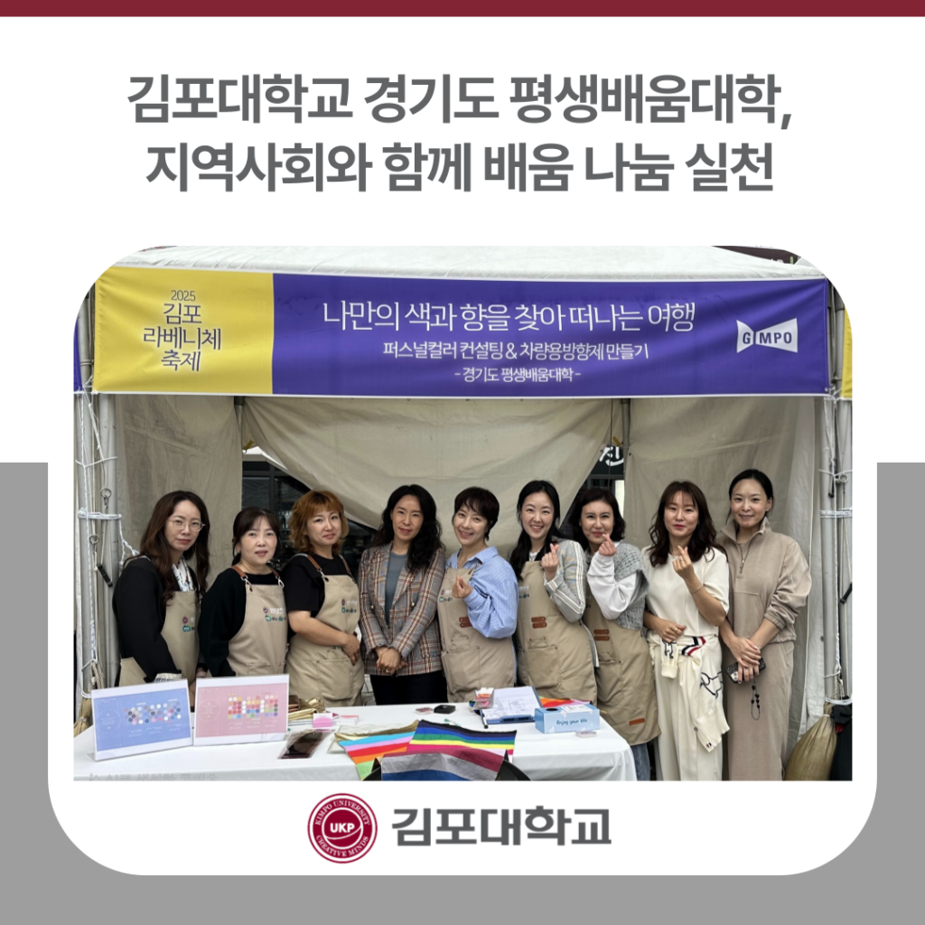 김포대학교 ‘빛나G’ 수강생들, 지역 행사 통해 평생학습 가치 확산 김포대학교(총장 박진영) 경기도 평생배움대학(GCC) ‘빛나G’ 캠퍼스 수강생들이 지역사회 주요 행사에 참여하며 주민들과 함께 배우고 나누는 평생학습의 장을 만들어가고 있다. ‘빛나G’는 김포대학교에서 운영 중인 경기도 평생배움대학(GCC) 프로그램으로 조향사 자격증 기반 퍼스널컬러 융합 전문가 양성과정, Cafe&Bakery 취업·창업 마스터 과정 수강생들이 활동하는 학습 공동체다. 이들은 학습을 통해 얻은 전문지식과 […]
