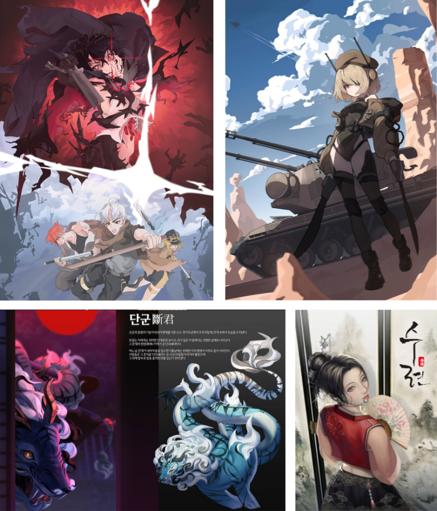 △ 김포대학교 게임콘텐츠과 학생들의 제40회 디자인&일러스트레이션 국제공모전 수상작들(왼쪽 위부터 시계방향으로 ‘김교만 특별상’을 수상한 이희찬 학생의 ‘불화 끝에 광기’, 장려상 강민성 학생의 ‘사막작전’, 특선 김나현 학생의 ‘수련’, 오은채 학생의 단군’).