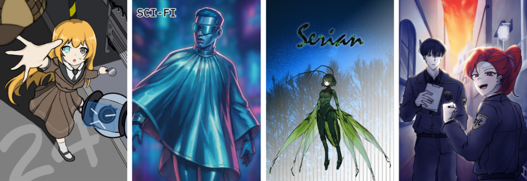 △ 김포대학교 게임콘텐츠과 학생들의 제40회 디자인&일러스트레이션 국제공모전 입선작들(왼쪽부터 안정환 학생의 ‘지능은 100%, 행동은 20%, 탐정과 드론 보좌관’, 장우형 학생의 ‘산소’, 김태경 학생의 ‘세리안’, 김지유 학생의 ‘MIC현장팀’).