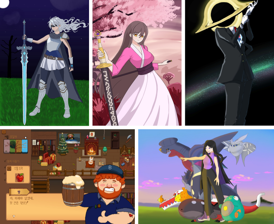 △ 김포대학교 게임콘텐츠과 학생들의 제40회 디자인&일러스트레이션 국제공모전 입선작들(왼쪽 위부터 시계방향으로 김형준 학생의 ‘에이라: 운명을 바꾸는 여정’, 홍기표 학생의 ‘고요한 결’, 윤지섭 학생의 ‘코즈믹’, 최윤지 학생의 ‘내가 좋아하는 길’, 홍나연 학생의 ‘오후 11시의 기쁨’).